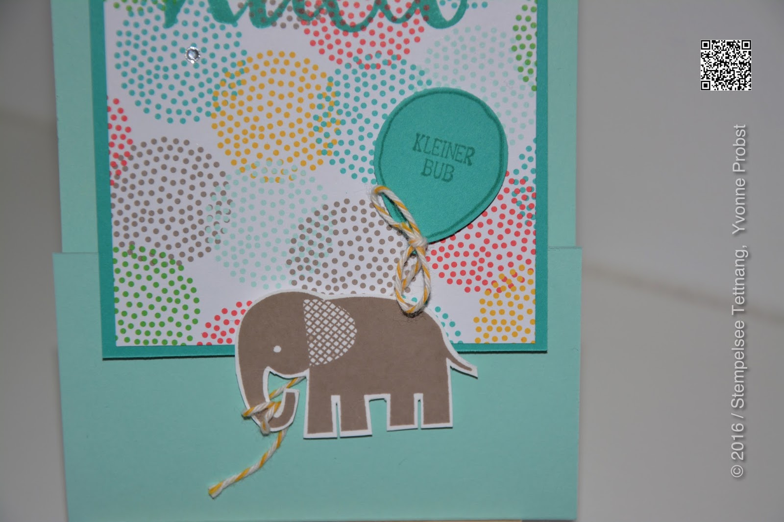 Elefant: Stempelset Zoo Babies, Stempelset Partyballons, Handstanze Luftballons, Stempelset Hallo, Stempelset Kleines großes Wunder, Designerpapier im Block "Bunte Party", Kordel Curry-Gelb/weiß, Farbkarton in Aquamarin und Bermudablau, Stempelfarbe in Taupe und Bermudablau, Straßsteine